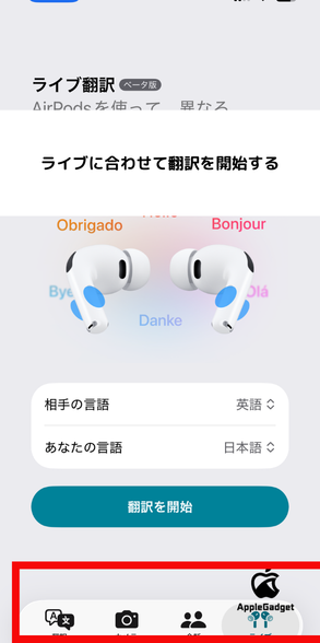 翻訳アプリを開いた状態で、あらかじめペアリングしているAirPods Pro 3が自動的に接続され、通話開始時にライブ翻訳機能がアクティベートされる準備が整うのです。